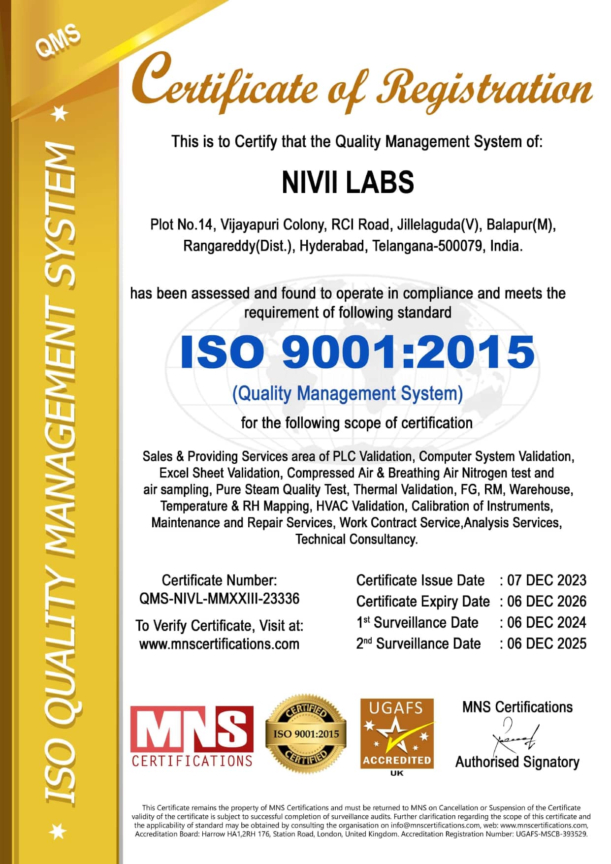 NIVII LABS PVT LTD is an ISO 9001:2015 certified company specializing in Calibration, Thermal, HVAC, Compressed/Nitrogen Air, and Pure Steam Validations, along with All Chambers Maintenance & Documentation. Based in Hyderabad, we deliver precise, reliable, and cost-effective services that ensure compliance with global standards and support the operational excellence of our clients. Read More....